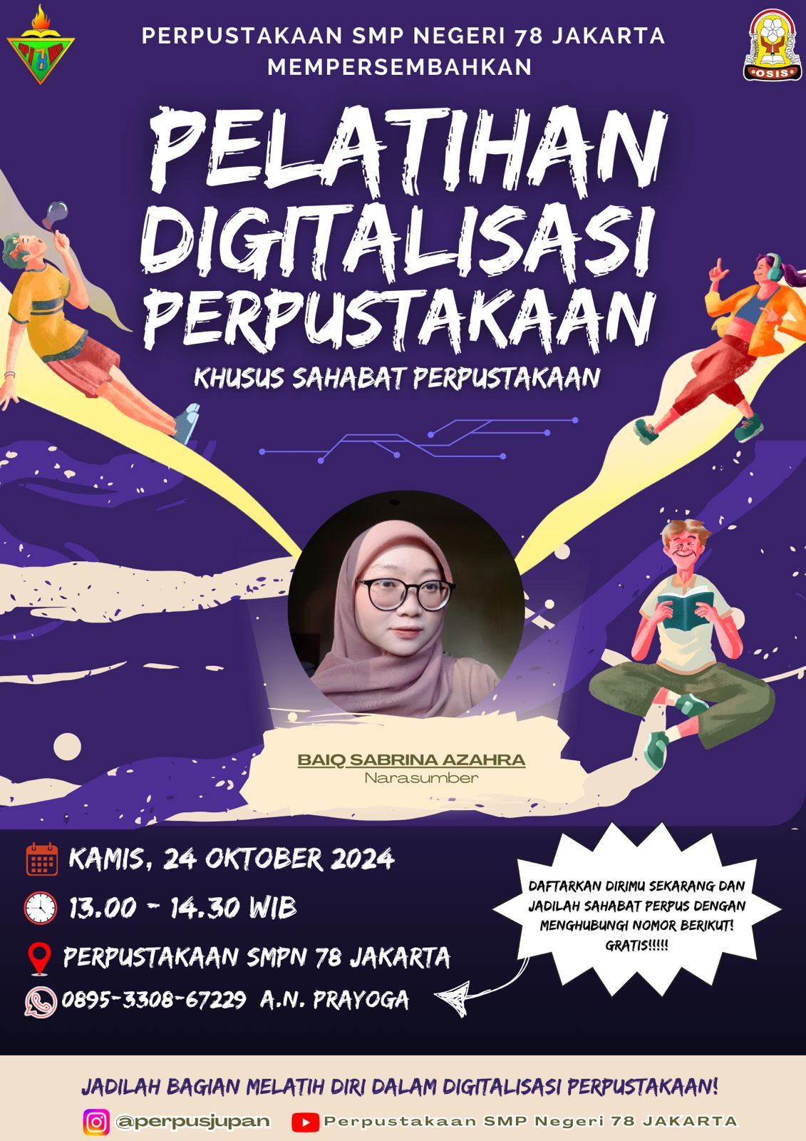Perpustakaan SMP Negeri 78 Jakarta mengadakan pelatihan pada Kamis, 24 Oktober 2024, dengan judul “Pelatihan Digitalisasi Perpustakaan”. Pelatihan ini menjadi wadah bagi anggota-anggota sahabat perpustakaan untuk mempelajari sistem otomasi Perpustakaan SMP Negeri 78 Jakarta, dan proses kerja digitalisasi perpustakaan. Narasumber dalam kegiatan ini ialah Baiq Sabrina Azahra, S.S.I., yang merupakan sarjana Perpustakaan dan Sains Informasi Universitas YARSI. Kegiatan pelatihan ini diikuti oleh siswa/i kelas VIII SMP Negeri 78 Jakarta. Dalam pelaksanaannya, materi yang disampaikan adalah: